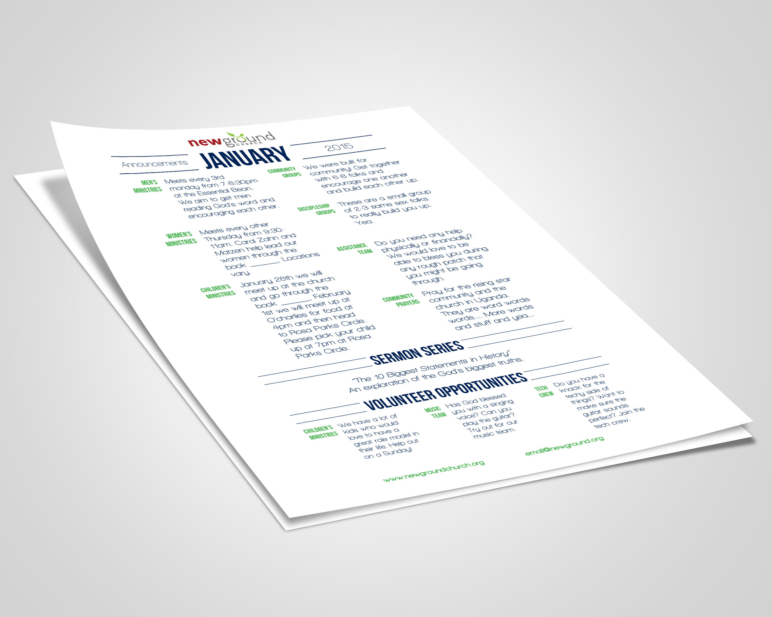 New Ground is a vibrant church community in Caledonia, MI, that I have done graphic work for over the past couple years through Mike Zaagman. I created their video introduction as well as announcement handouts and the images and short animations to introduce several of their sermon series. It is always fun creating pieces for them, as their programs and sermon series are always unique and engaging. It is always refreshing when a church seeks to engage the attention and participation of all ages and types of people.